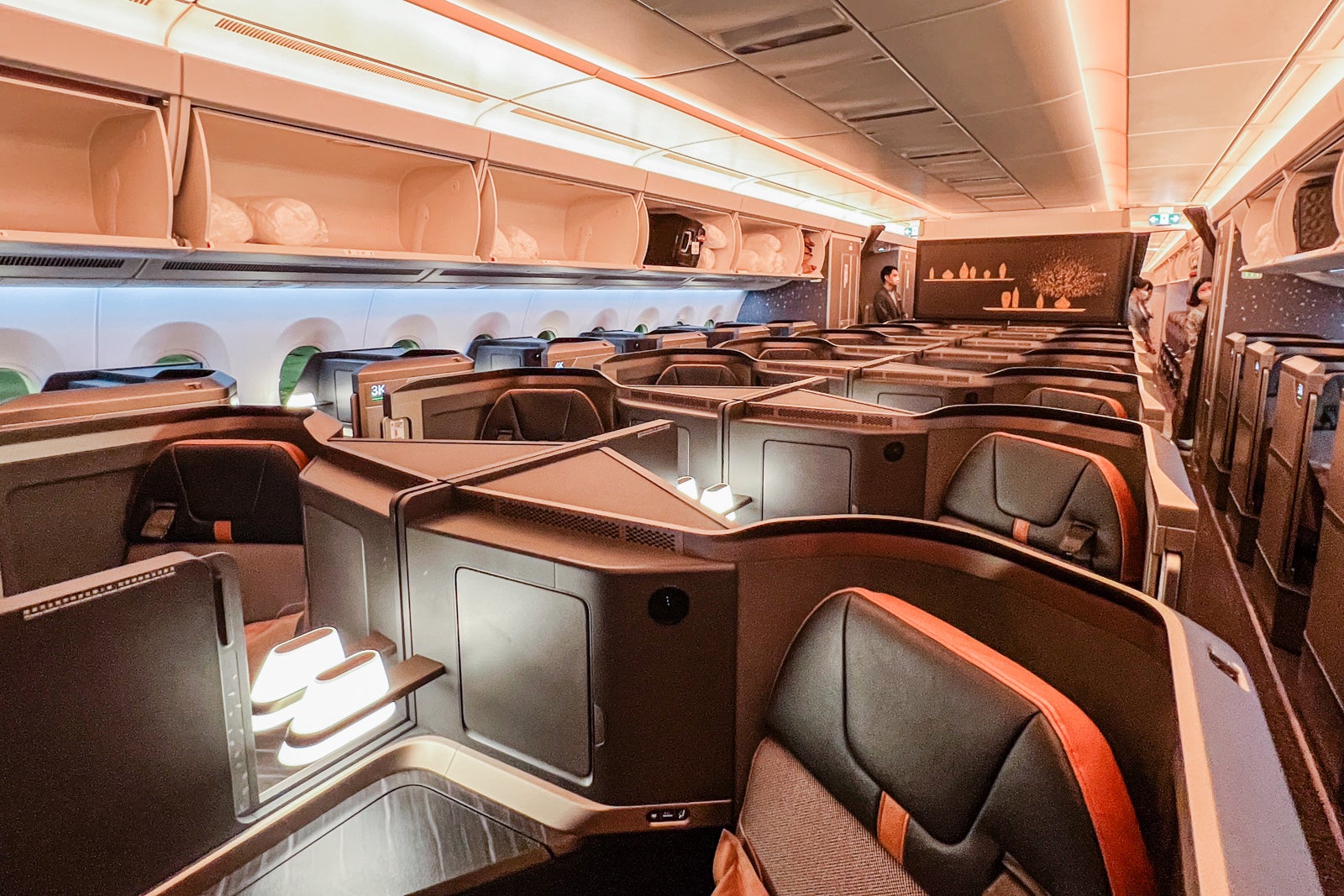 Starlux’s Airbus A350 has seven rows of enterprise class within the entrance of the aircraft, consisting of 26 seats organized in a reverse herringbone 1-2-1 configuration. Each seat has direct aisle entry and privateness sliding doorways.
