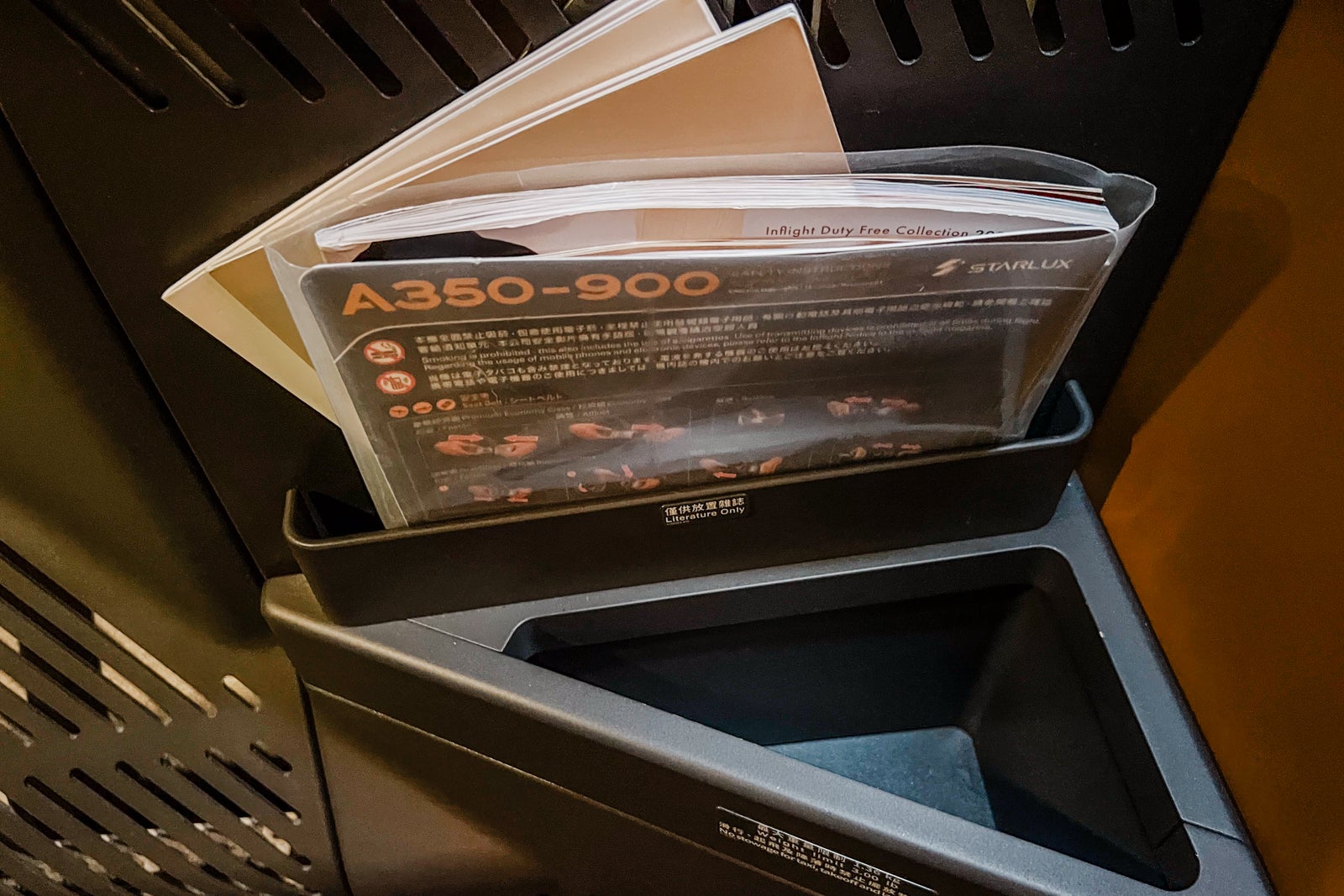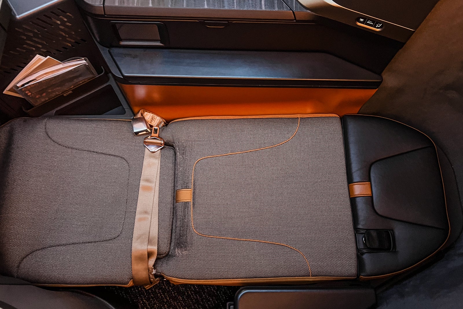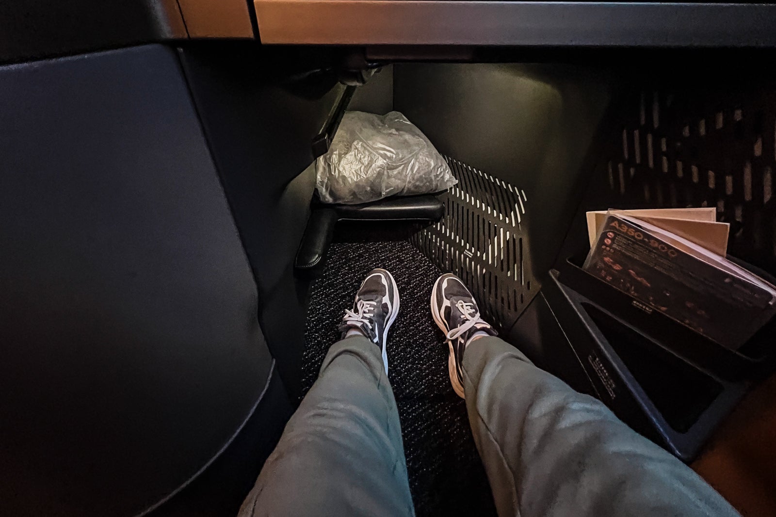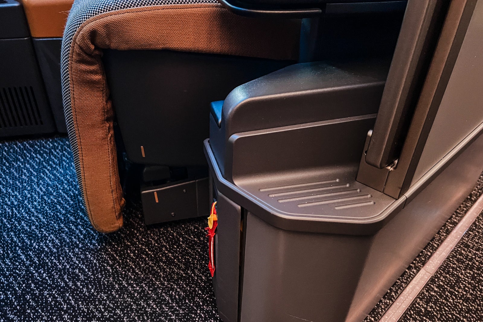 A small open cubby offered extra storage alongside the aspect of the seat not removed from the footwell; there was additionally a small pocket for the inflight duty-free journal and plane description.