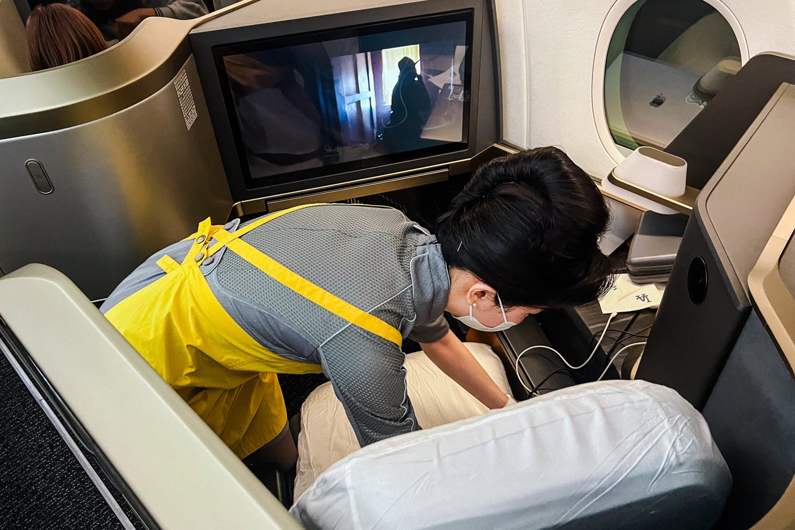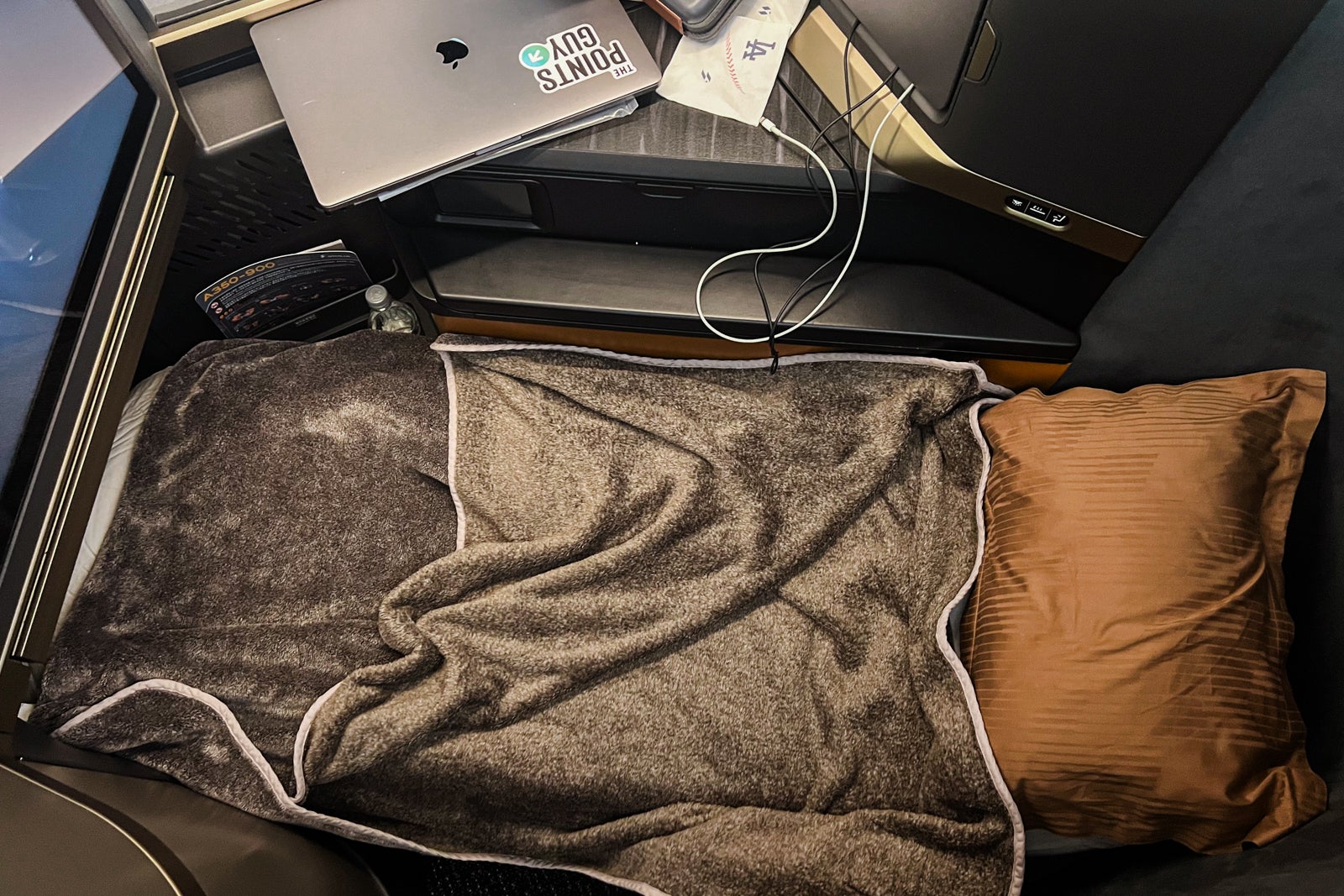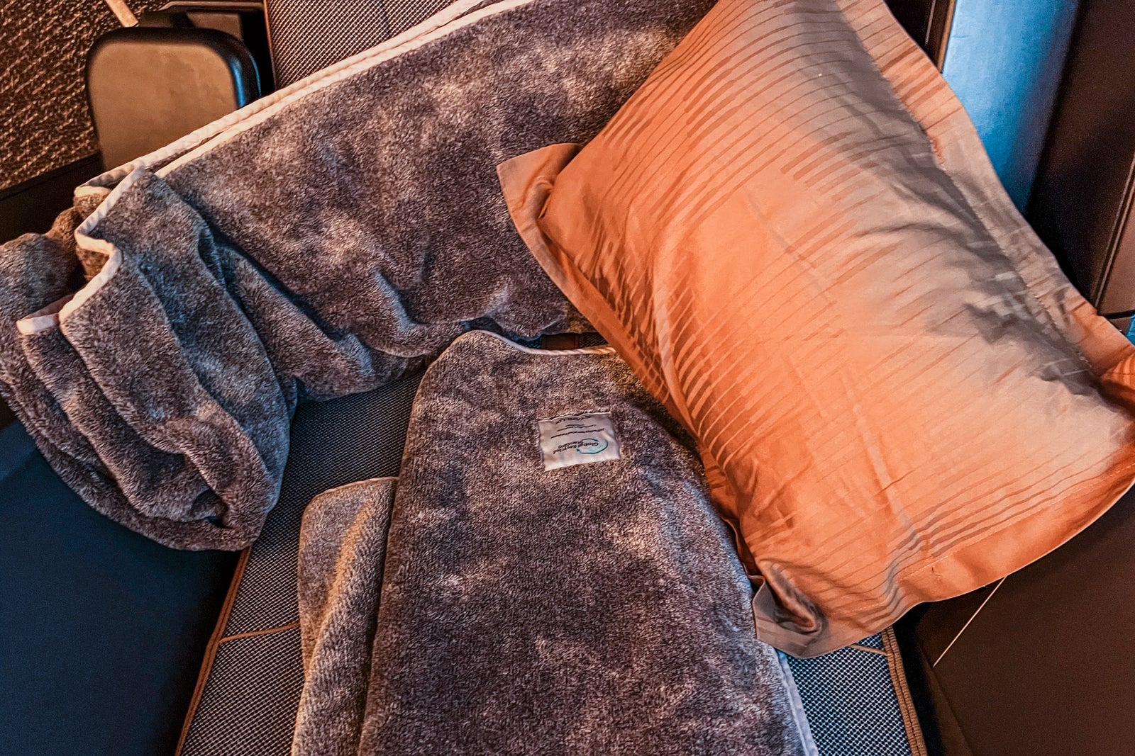 Every seat had a thick gold pillow and a cover blanket ready on the seat, in addition to slippers in their very own sealed bag. Mattress pads have been saved within the overhead bins however have been made accessible to passengers when it was time to sleep.