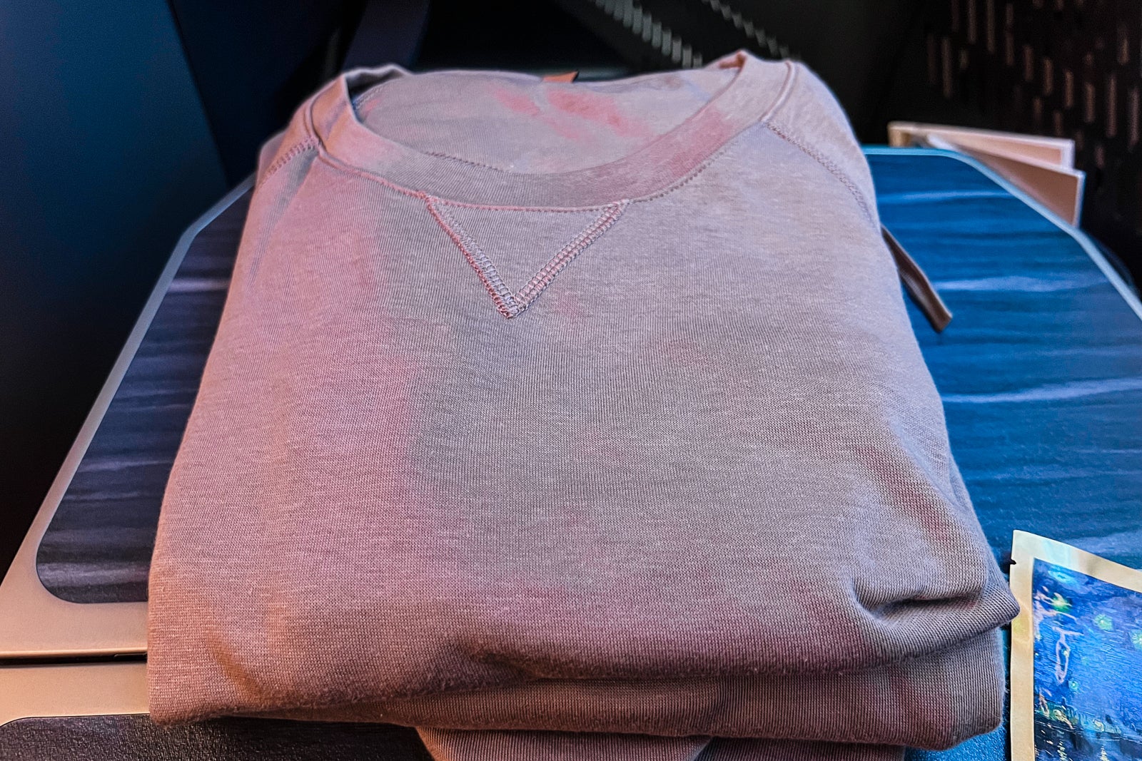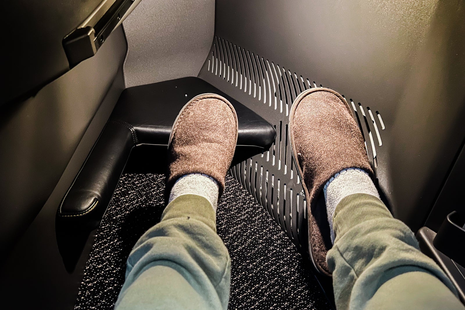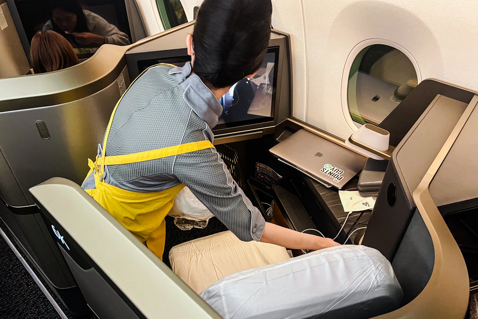 Every seat had a thick gold pillow and a cover blanket ready on the seat, in addition to slippers in their very own sealed bag. Mattress pads have been saved within the overhead bins however have been made accessible to passengers when it was time to sleep.