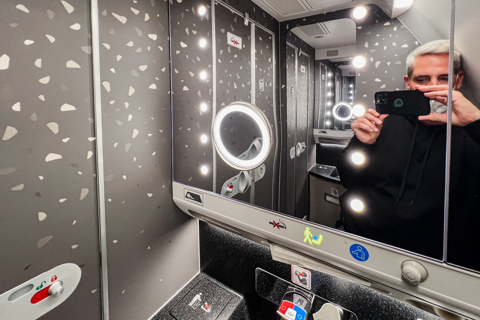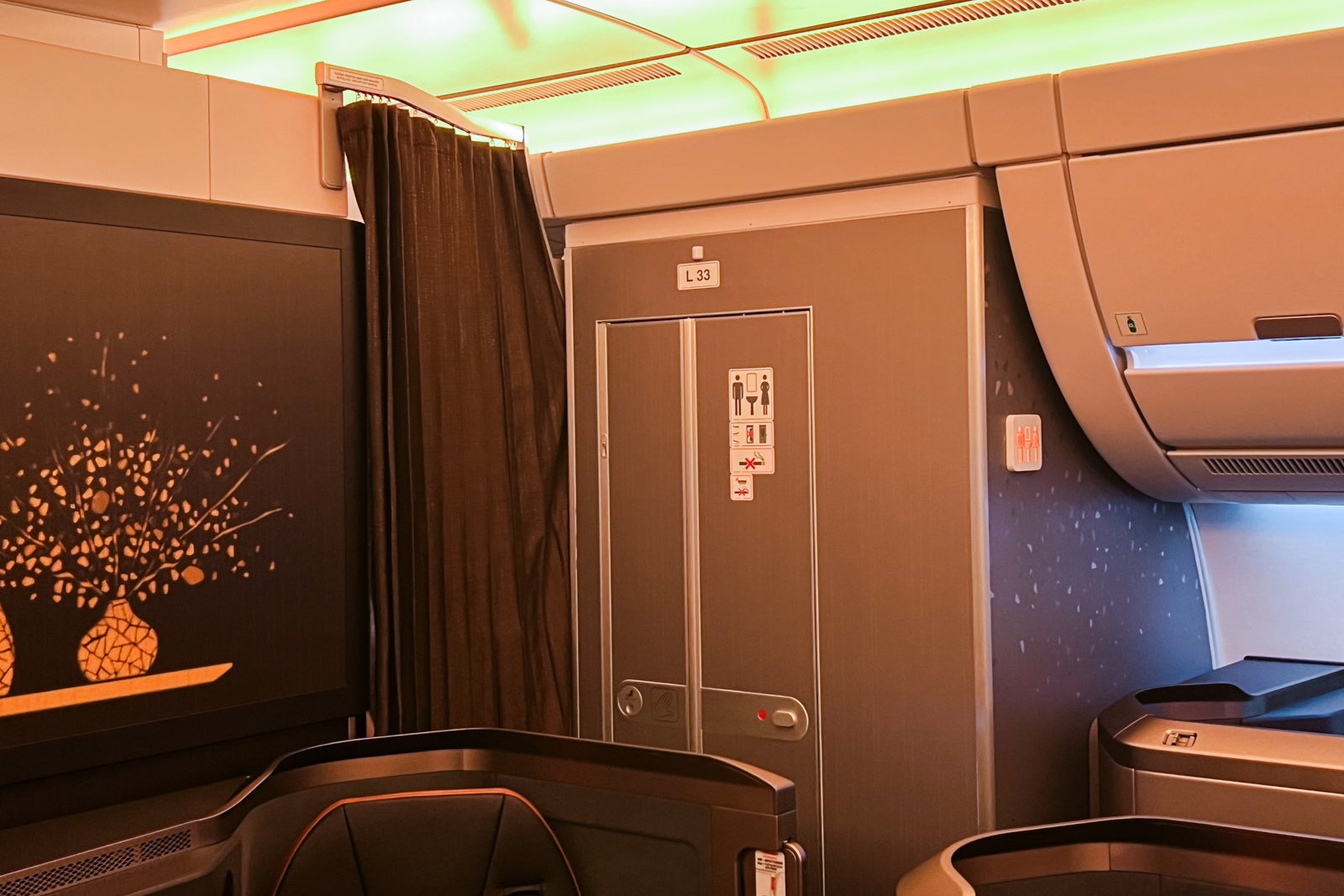 There have been two business-class restrooms, one on all sides of the business-class cabin close to the galley on the again. There was one other toilet close to the cockpit that was principally off-limits for business-class passengers.