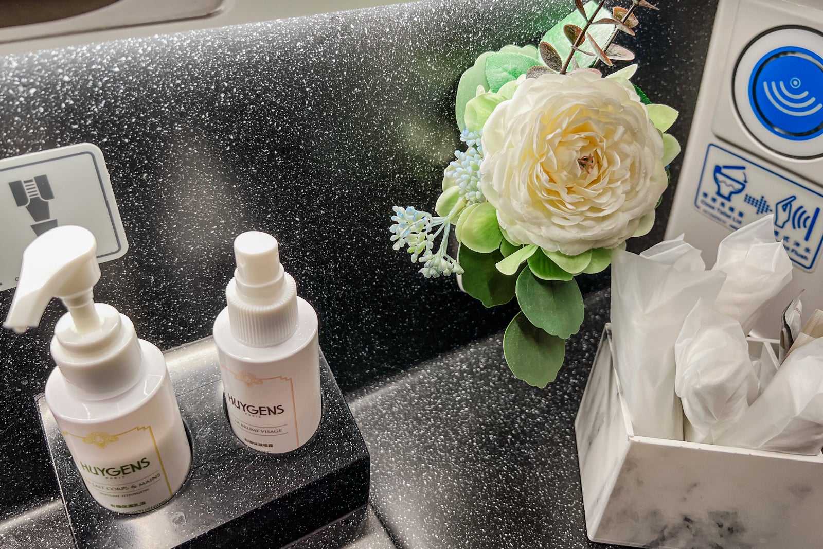 Inside the toilet, I discovered dental floss, mouthwash and towelettes for purchasers to make use of, however there was additionally face mist and lotion by the French skincare model Huygens.