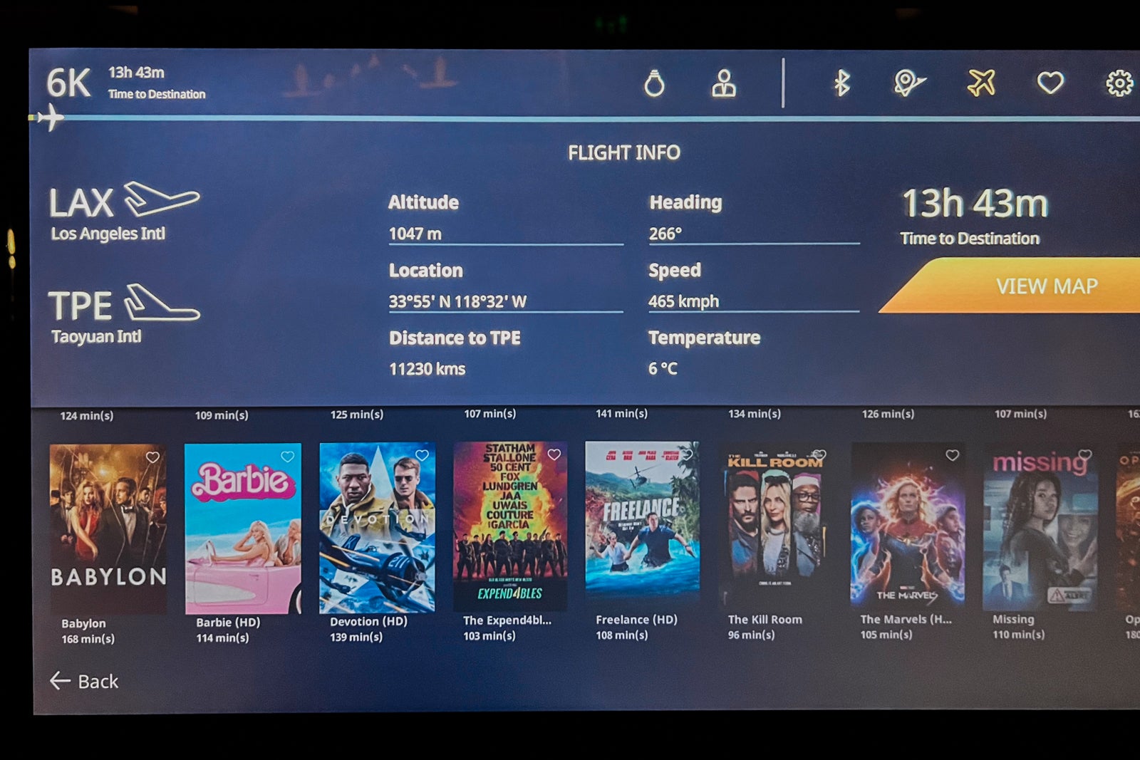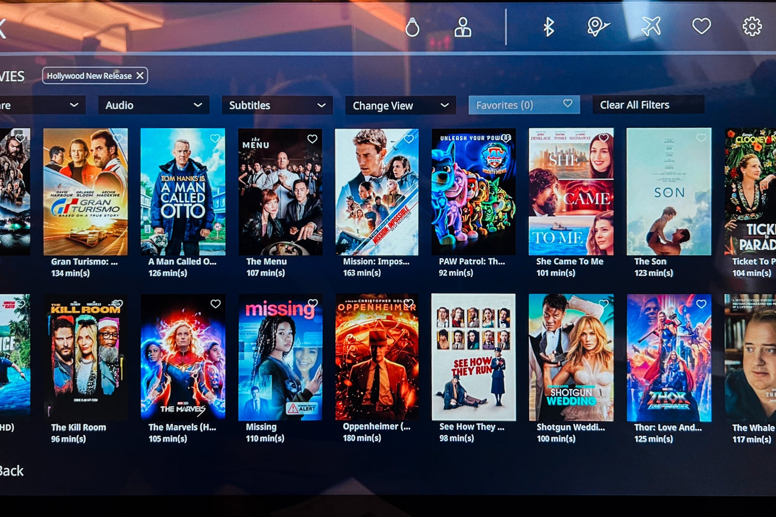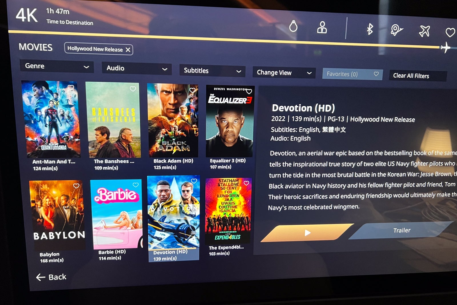The wonderful 4k-resolution inflight leisure display measured 24 inches. I counted 26 Hollywood new releases, in addition to some classics like “Breakfast at Tiffany’s.”