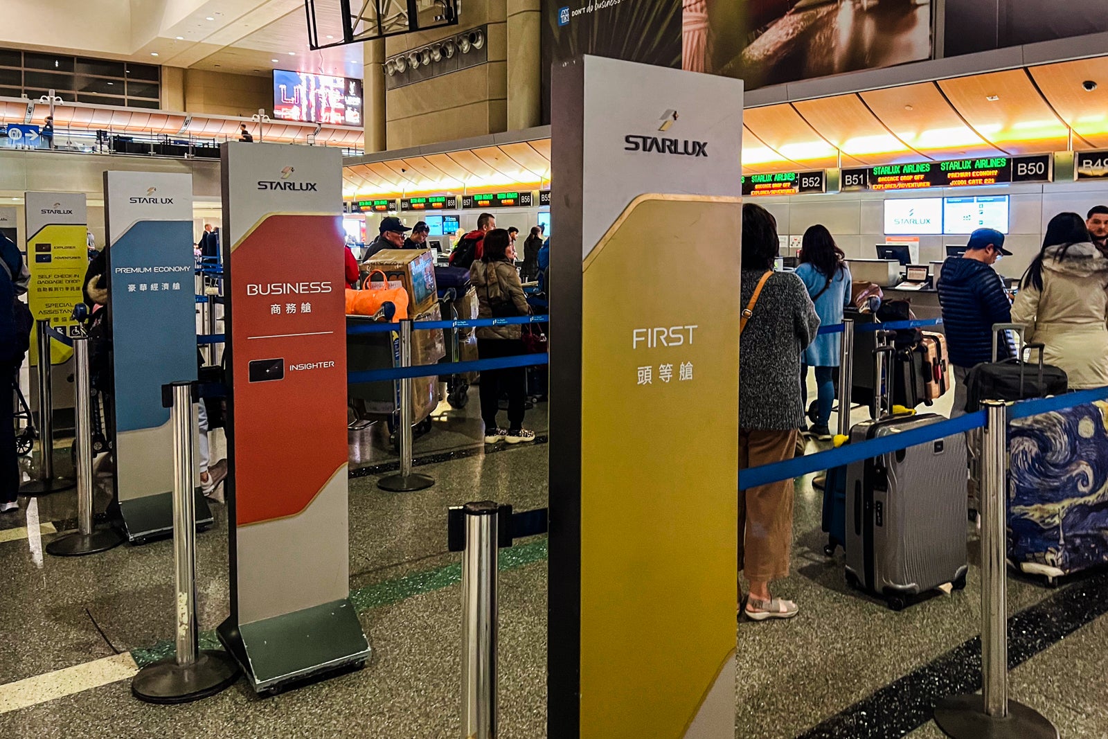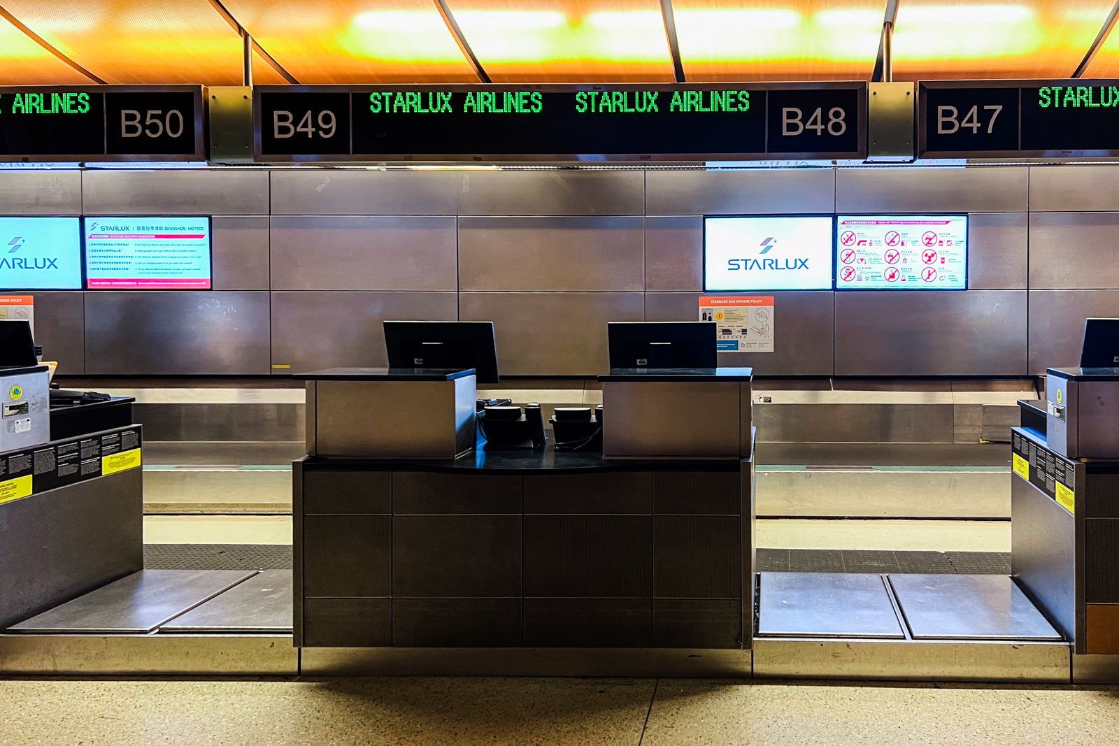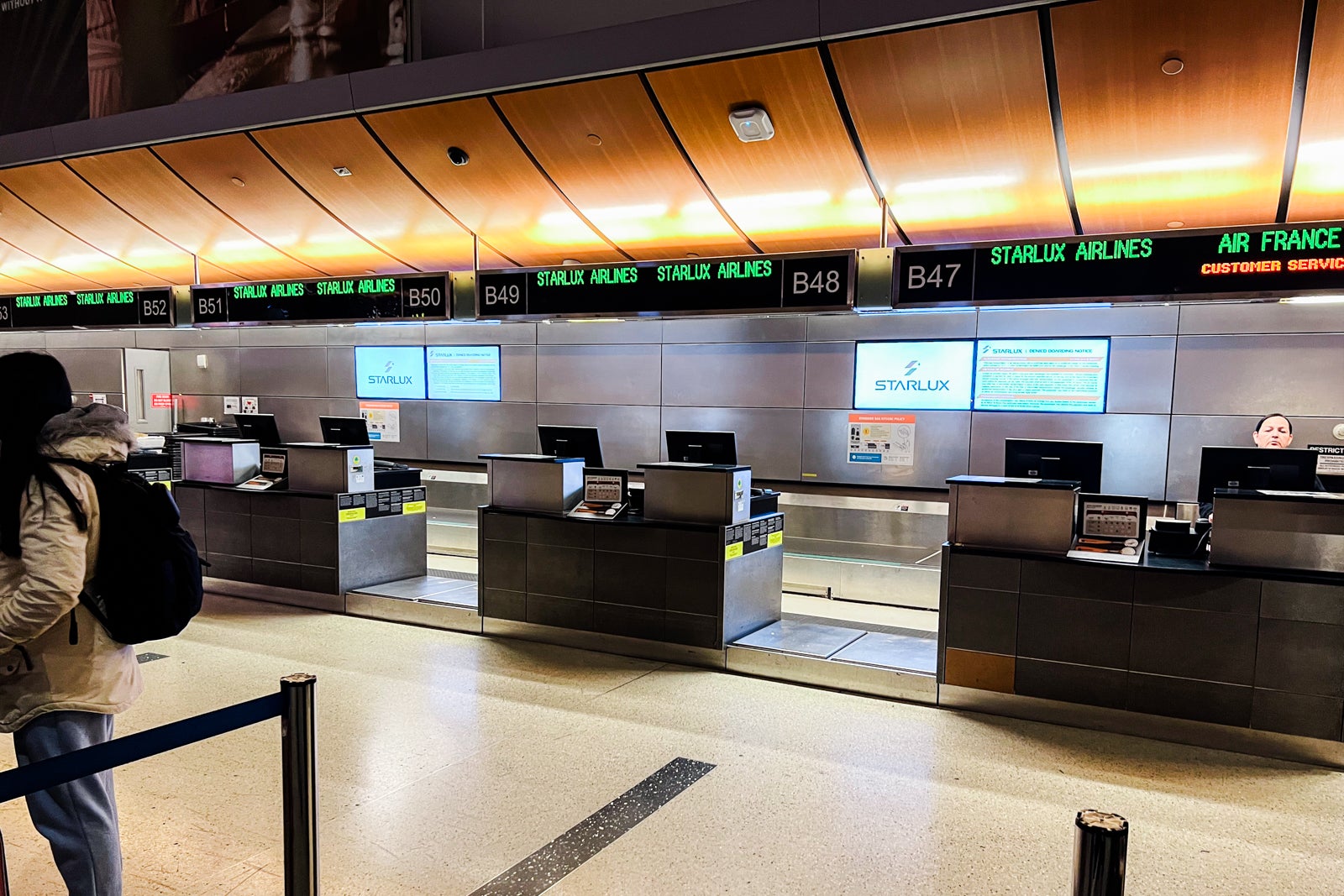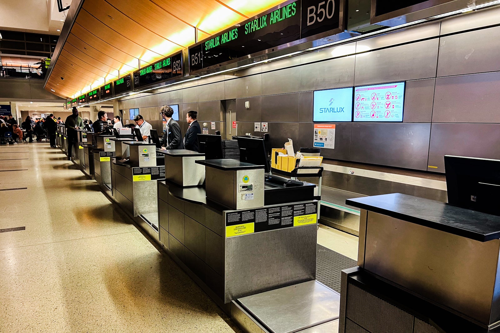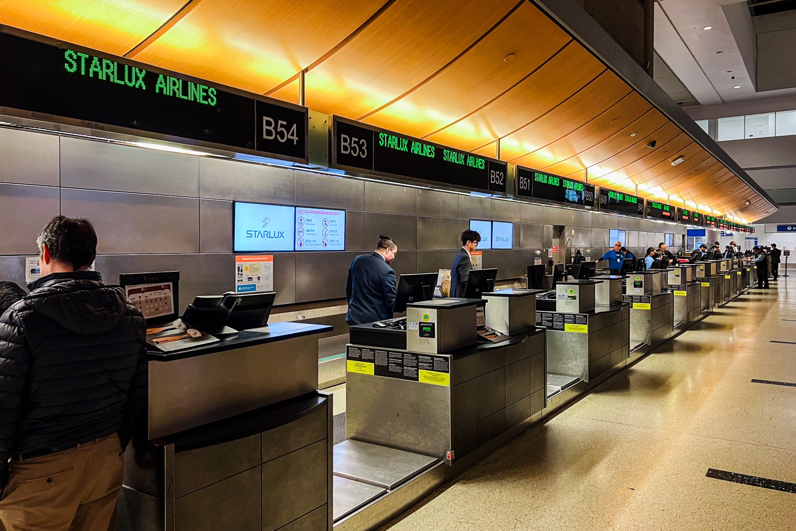 There was no line after I arrived at 6:50 p.m., however there have been additionally only a few staff. Starlux check-in desks don’t formally open till 7:30 p.m., about three and a half hours earlier than the flight. These counters have been B47 by means of B54.