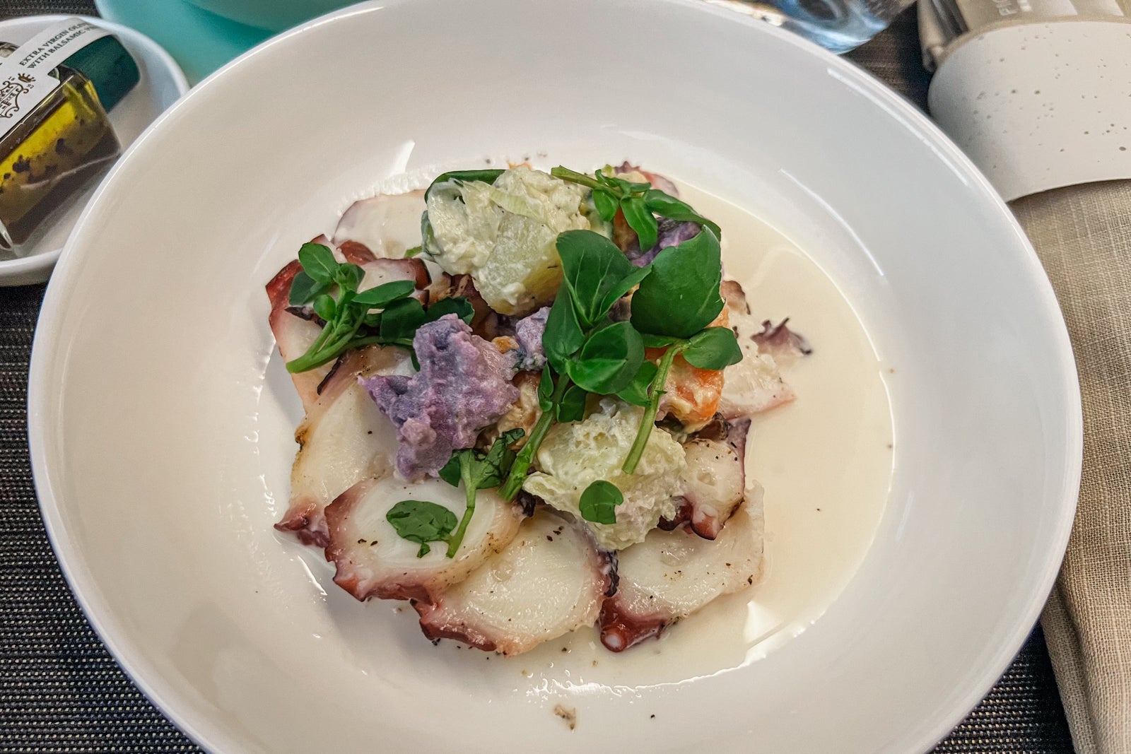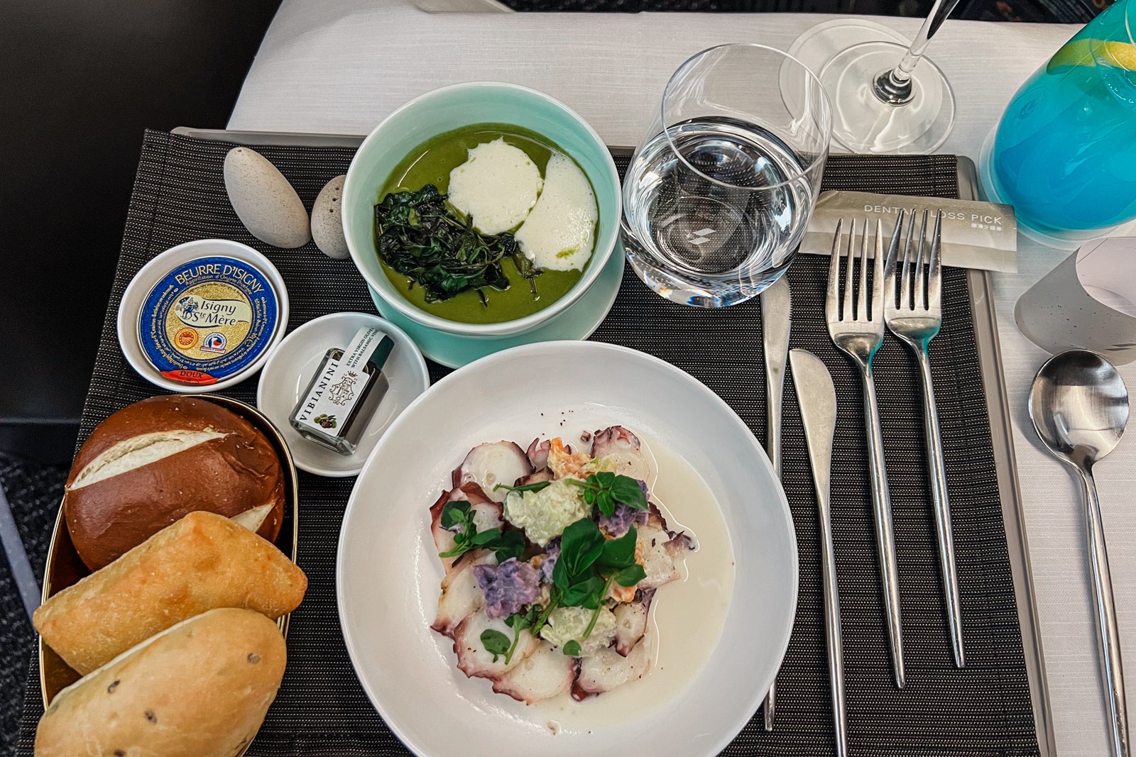 The primary course got here on a single tray about an hour into the flight. It consisted of octopus salad and a scorching spinach soup served with water and a bit of heat items of bread.
