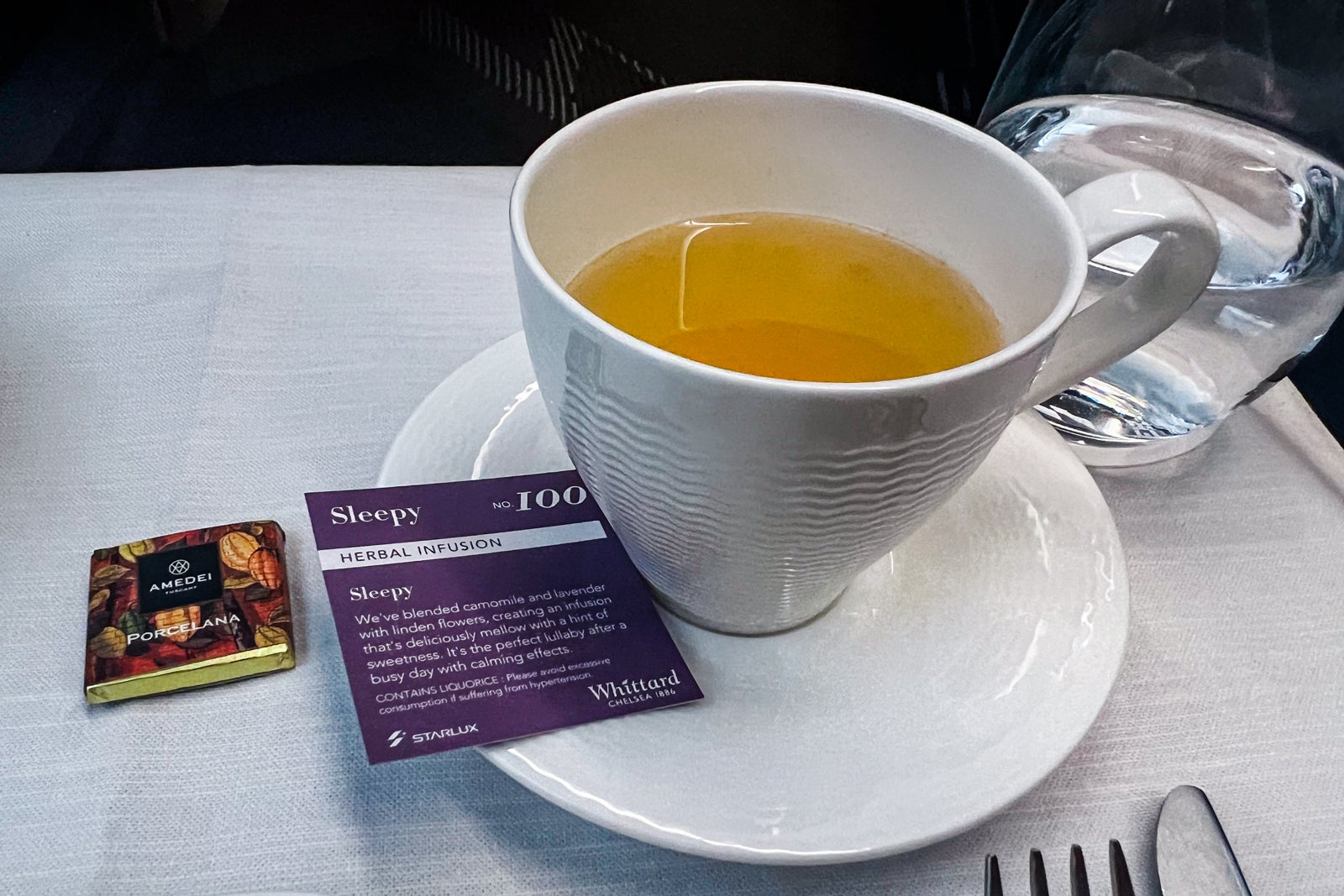 I polished it off with Whittard’s “Sleepy” tea with a mix of camomile and lavender flavors. Meal service ended with a flight attendant bringing a cool washcloth. What a pleasant contact.