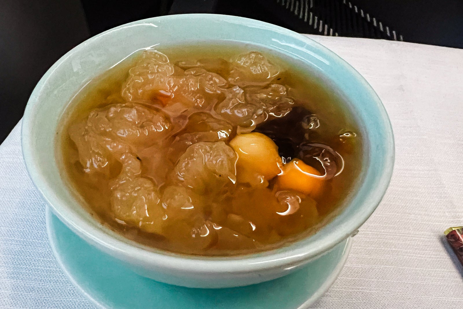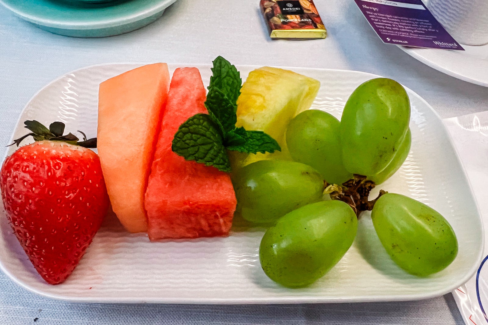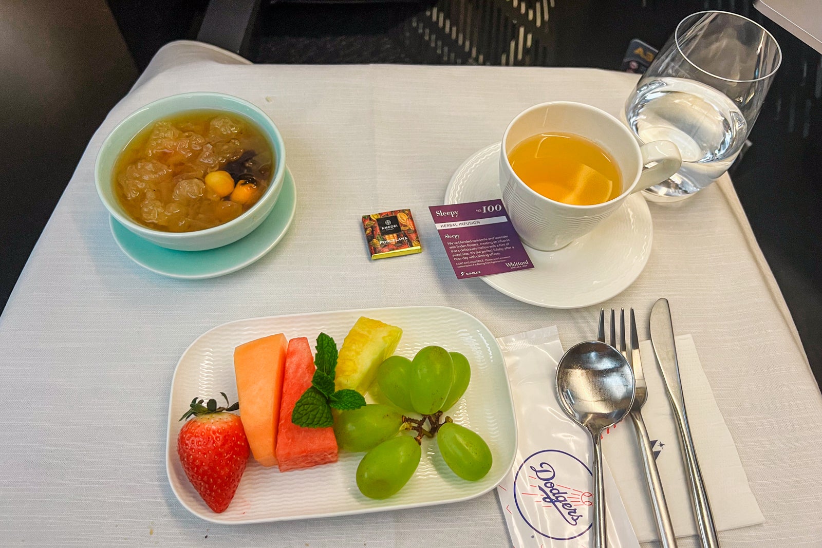 Desert was a candy congee soup labeled as peach gum and white fungus, with a small plate of contemporary fruit and a small Amedei chocolate from Tuscany, Italy. I wasn’t a fan of the congee, which the flight attendant stated was a well-liked dish amongst Taiwanese girls because it’s supposed to assist the pores and skin.