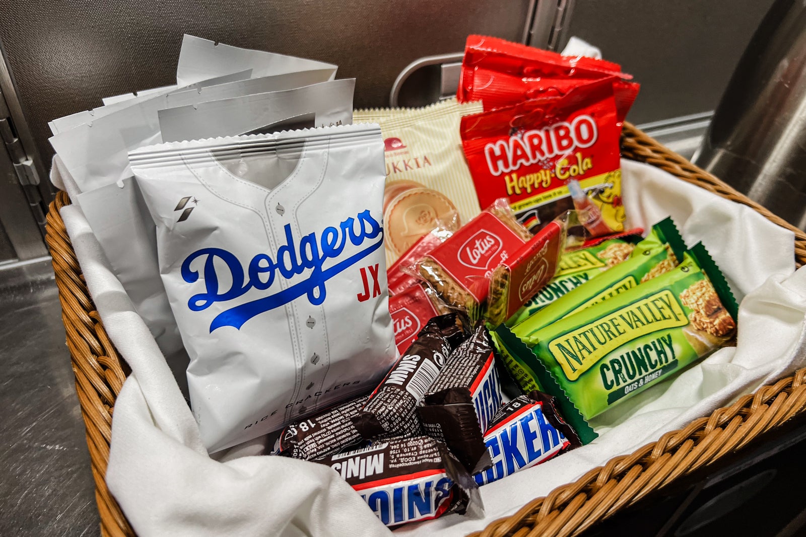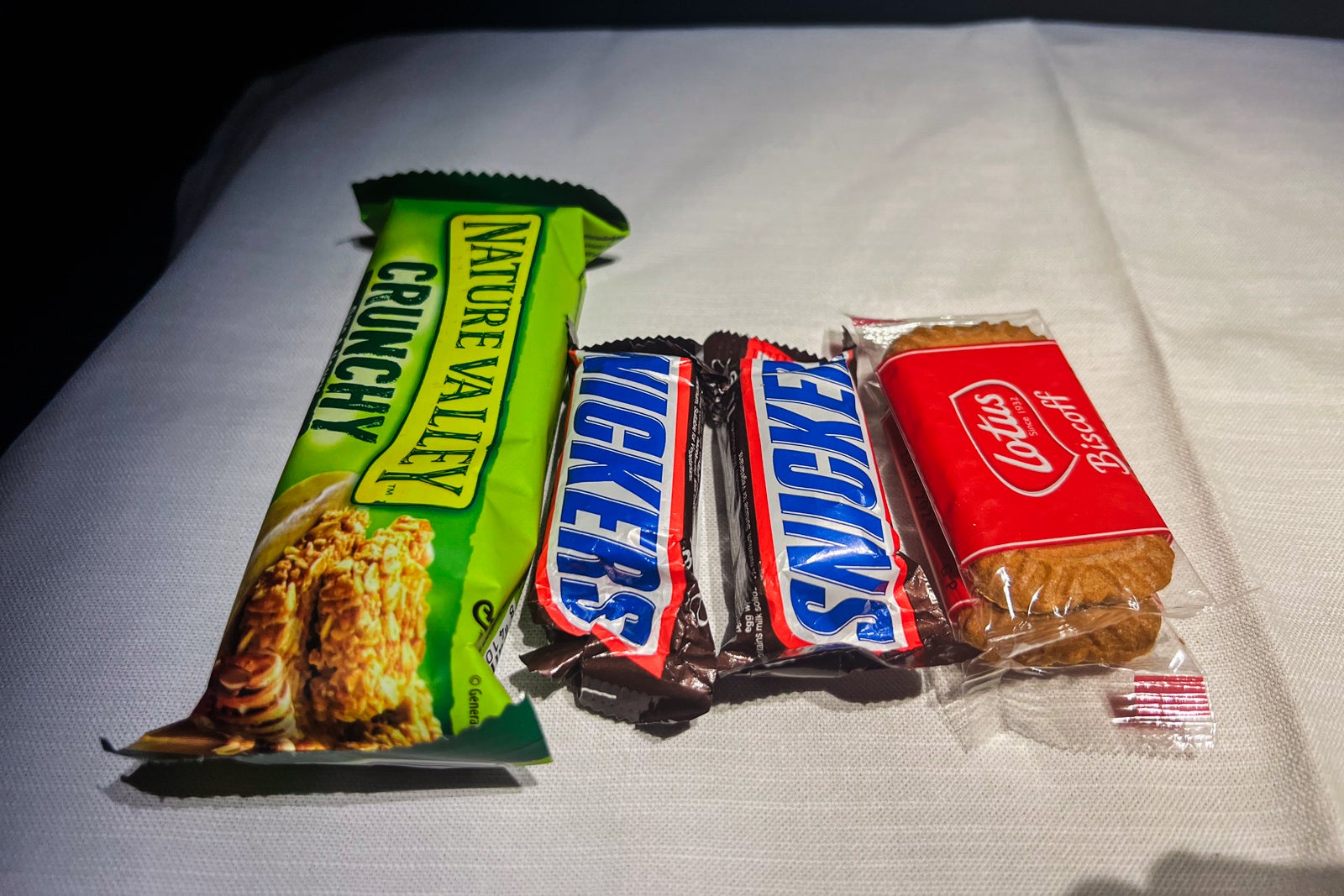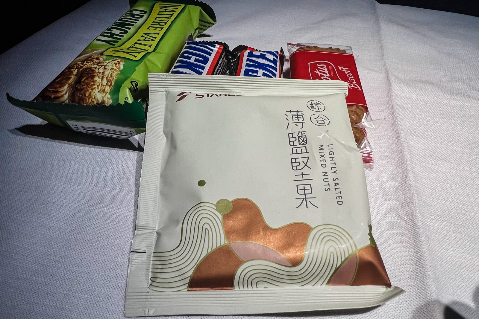 After a couple of hours of sleep, I took a peek within the business-class galley (the place I boarded the aircraft); there have been snacks arrange within the galley, together with luggage of blended nuts, premade sandwiches, miniature Snickers bars, Biscoff cookies and Nature Valley granola bars. The flight attendants supplied me a sandwich or noodles, neither of which appeared on the printed menu.