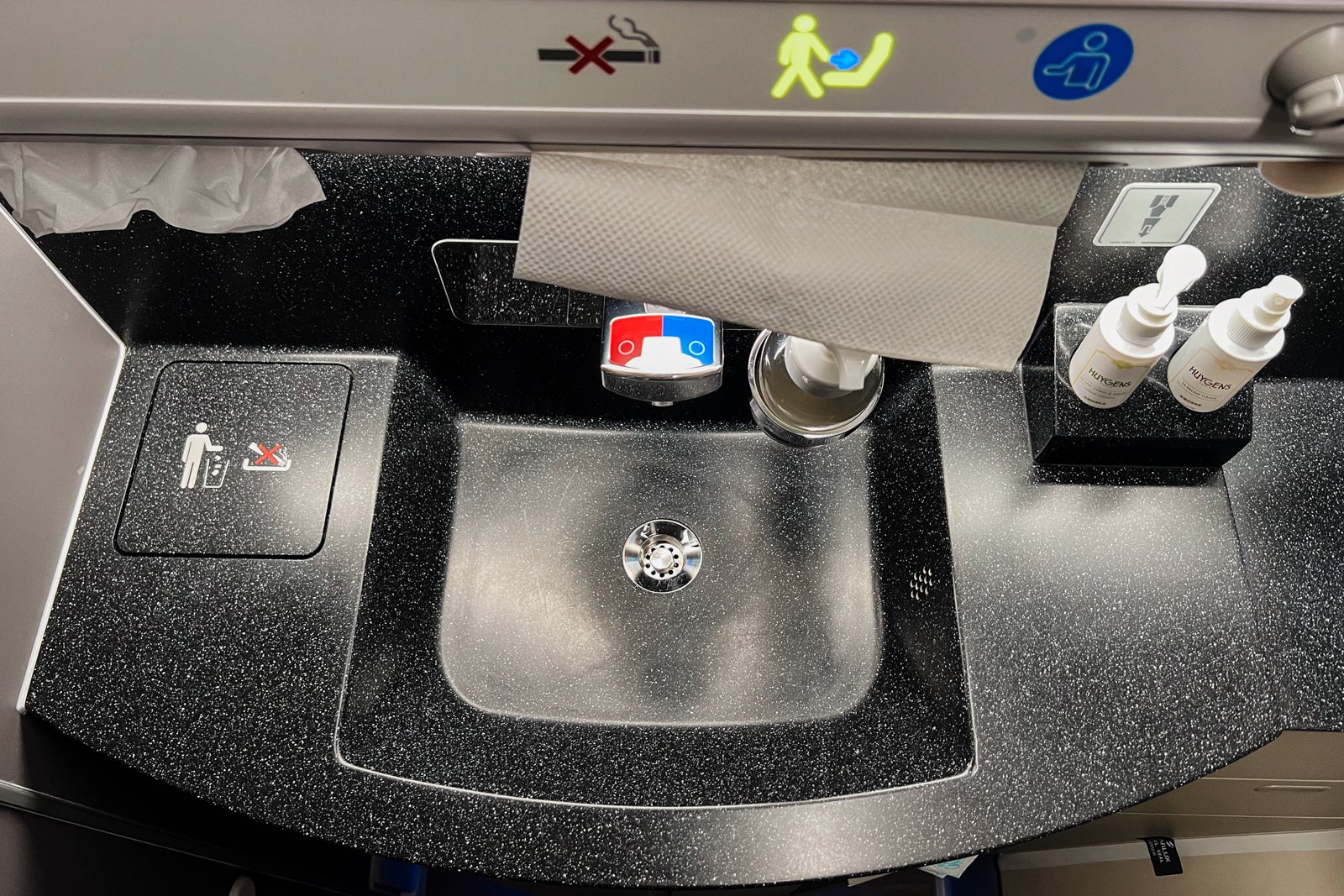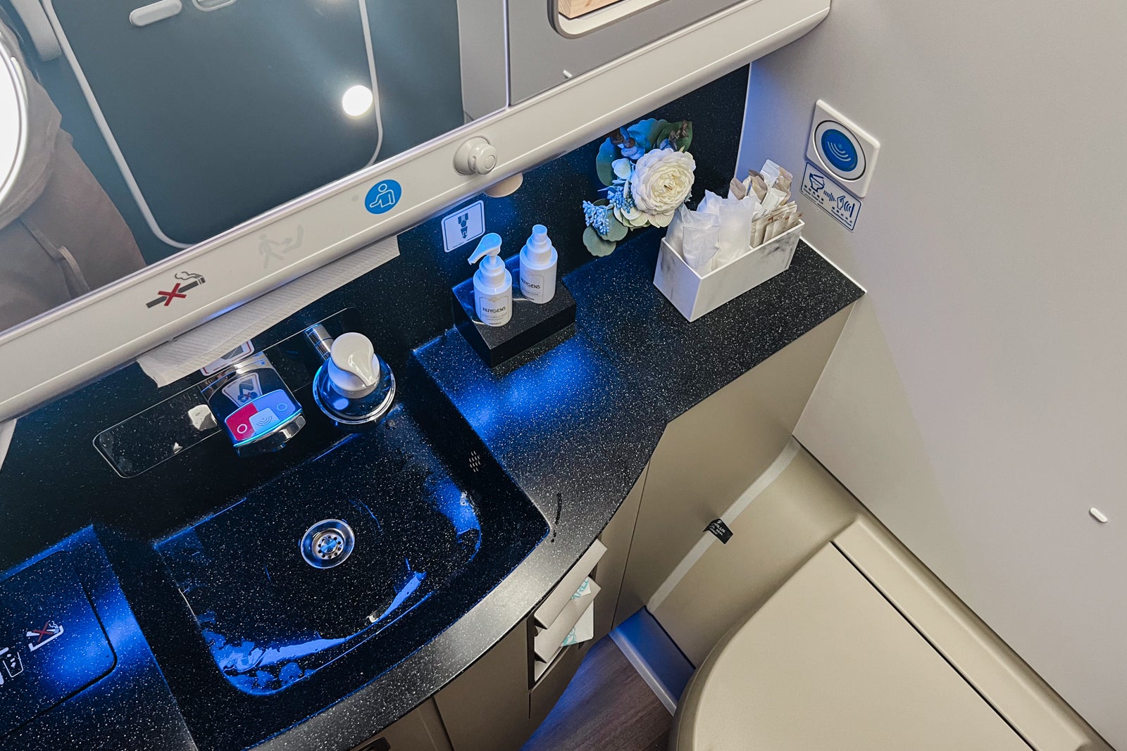 The opposite restroom is within the ahead galley, and it’s bigger than the 2 in enterprise class, although I positively bought the sense that the crew solely wished that utilized by first-class passengers.