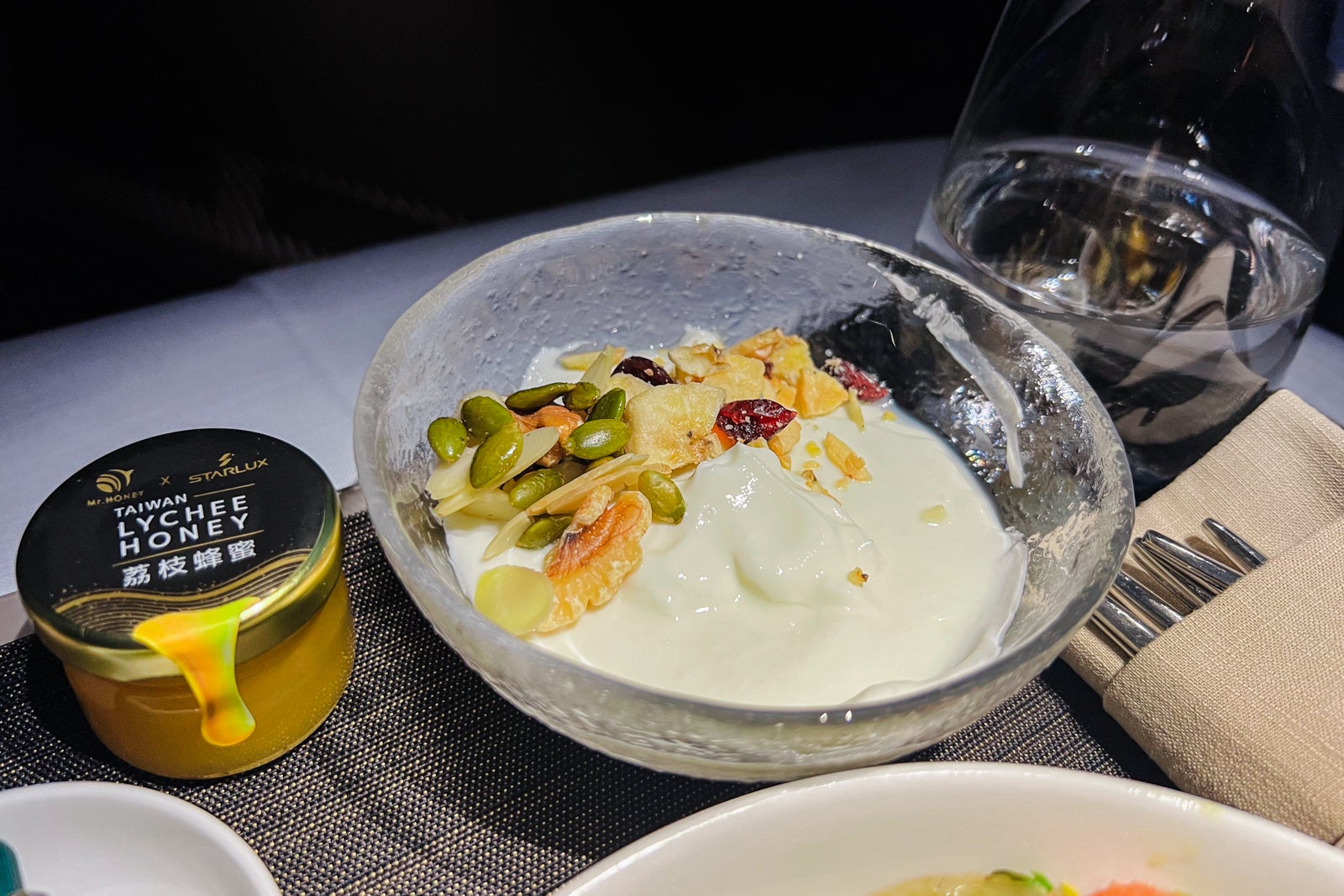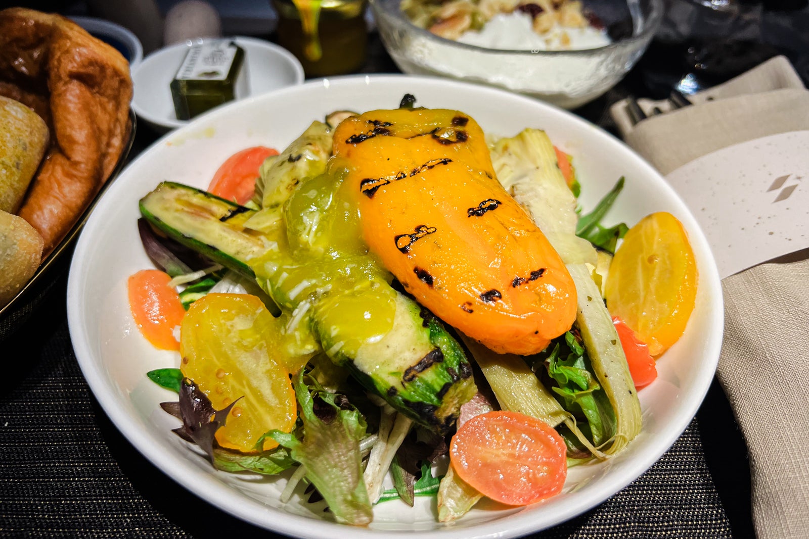 Two hours earlier than touchdown, a breakfast course of salad with charred zucchini and artichokes, roasted candy pepper and tomato was served. That got here on a tray alongside Greek yogurt with fruit and nuts inside and a aspect of Taiwanese lychee honey to combine into the yogurt. There was additionally a number of breads that tasted a lot brisker at breakfast. My favourite was an apple Danish pastry.