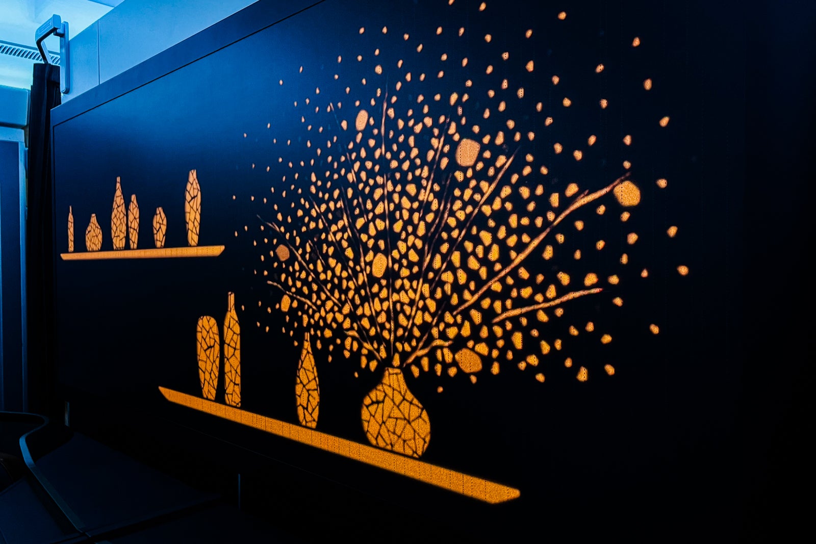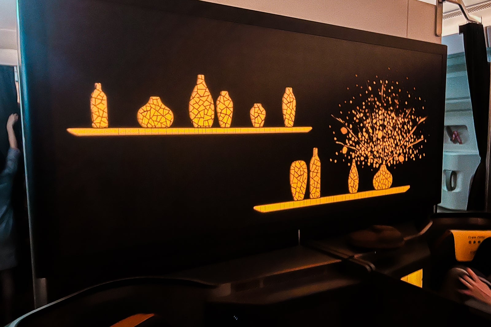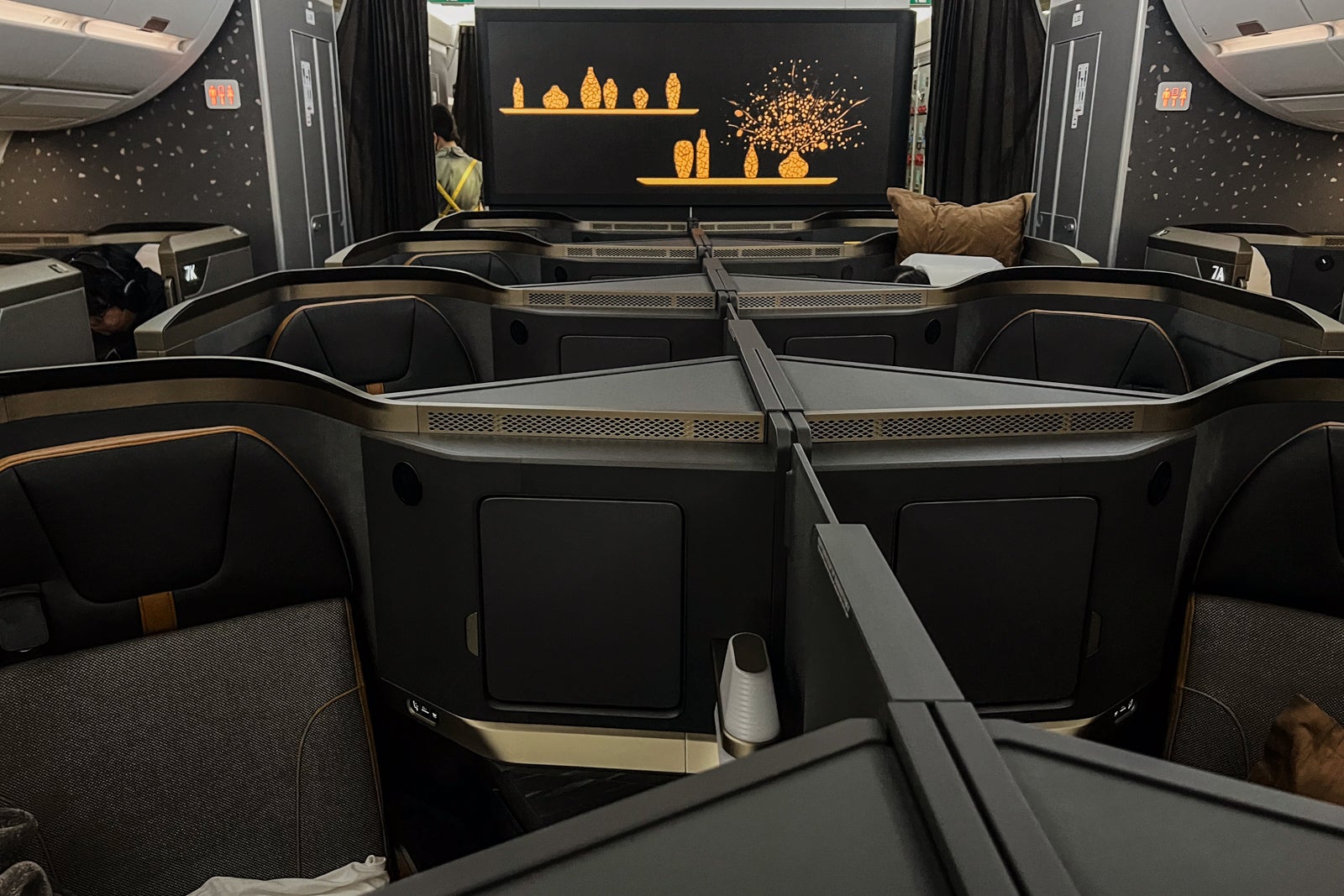 I discovered the Starlux business-class cabin to be visually beautiful, with a contemporary and classy cabin outfitted with refined branding touches like stars and hints of metallic gold. The gorgeous mural of flowers and vases on the galley wall was an particularly good contact. When the cabin was dim, refined lights sparkled within the mural.